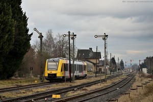 Abzweigbahnhof mit drei Bahnsteiggleisen und mechanischem Stellwerk der Bauart Jüdel