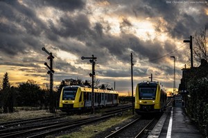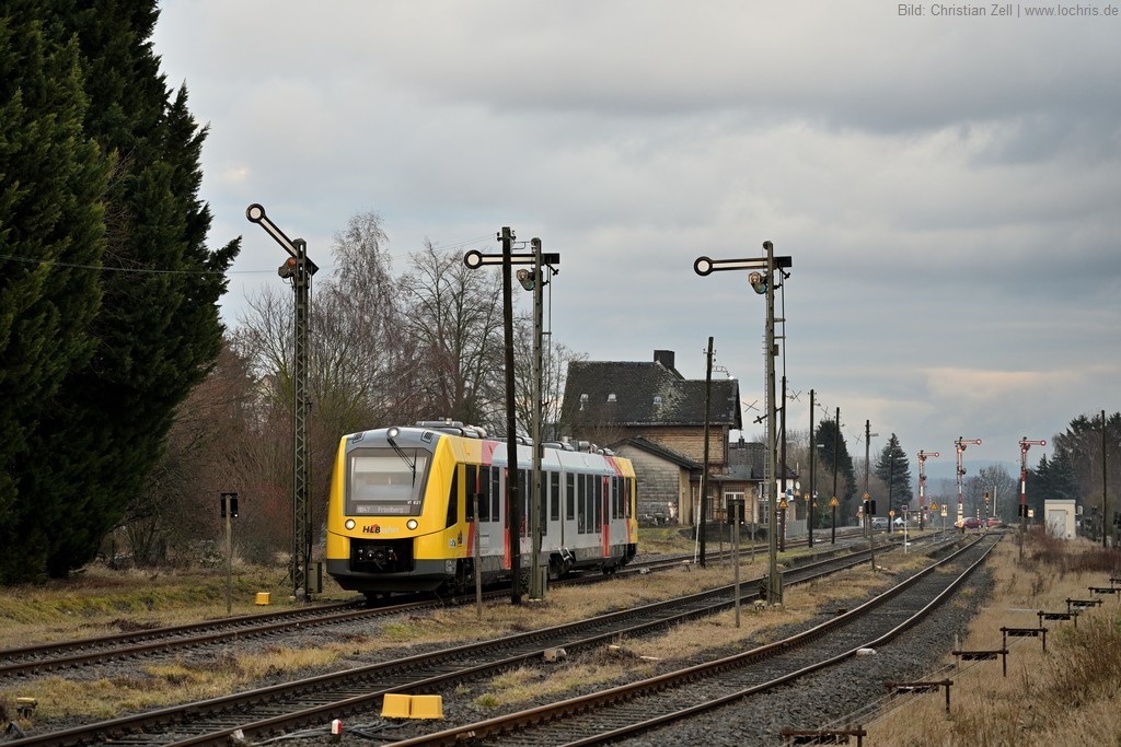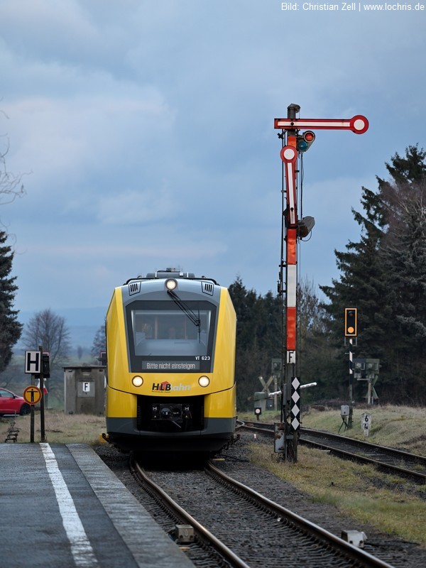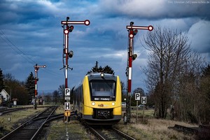 Abzweigbahnhof mit drei Bahnsteiggleisen und mechanischem Stellwerk der Bauart Jüdel